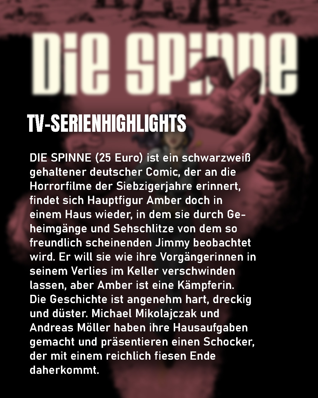 DIE SPINNE wurde 2019 im Verlag KULTCOMICS erstmals veröffentlicht. Im Mai 2022 erschien eine Neuedition mit 32 Extraseiten. Die Comicbände sind beim Verlag, im Comicshop, im Buchhandel und Online erhältlich.